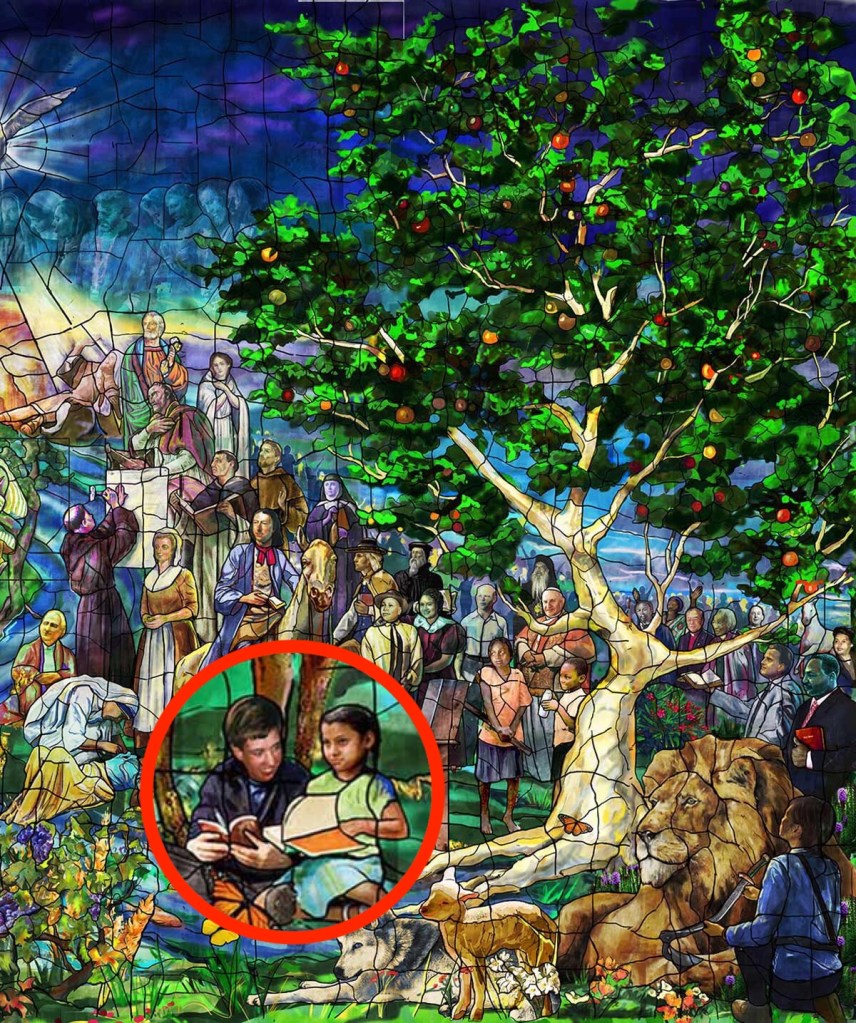 Matthew is featured on the far right side of that window (which more broadly features the three gardens of the biblical witness), and he is in the garden of promise. The image of him and the little girl is enlarged here, but he sits at the feet of John Wesley’s horse. He is reading a book and talking to a little girl of Native American descent. Reading and talking were two things he never did in this life.